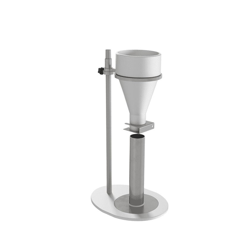 El embudo está montado en el soporte vertical junto con la tapa y la cuchilla de la regla. El vaso medidor está pulido por dentro y tiene una capacidad de 100 ml +/- 0,5 ml para el método ISO R 60 y ASTM D 1895 A. El vaso medidor tiene una capacidad de 400 ml para el método ASTM D 1895 B.