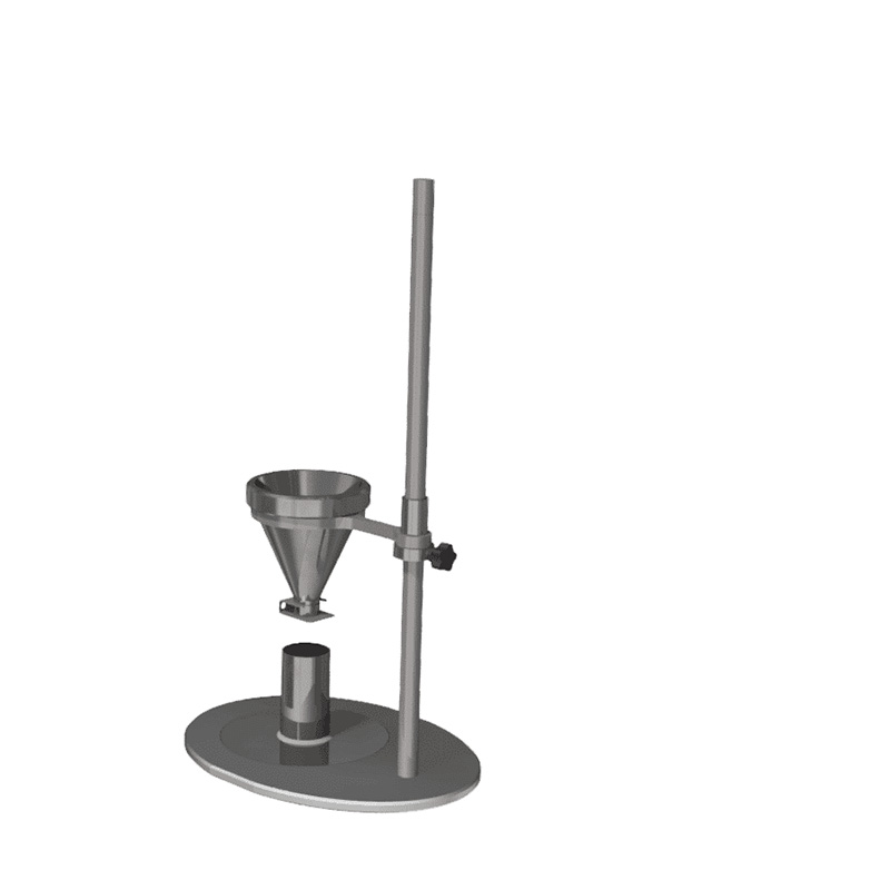El probador consiste en un embudo de alimentación con una tapa giratoria con resorte en la parte inferior, que está montada en una placa inferior sólida. La placa inferior está montada con una taza para medir el material y una bandeja de recogida (bandeja de goteo). Una vez que el material ha entrado libremente en el vaso de medición, el exceso se raspa con una cuchilla de punta recta.